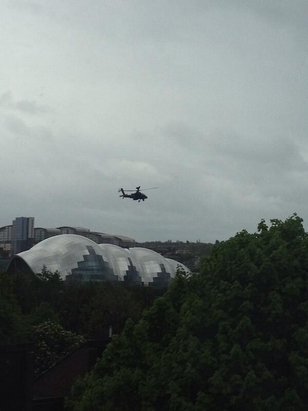: Not everyday you see a fully armed Apache gunship flying over Newcastle. It was very close.